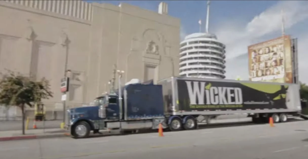 The intricate set designs of [WICKED] being unloaded from over a dozen trucks and loaded onto the stage of the Pantages Theatre.